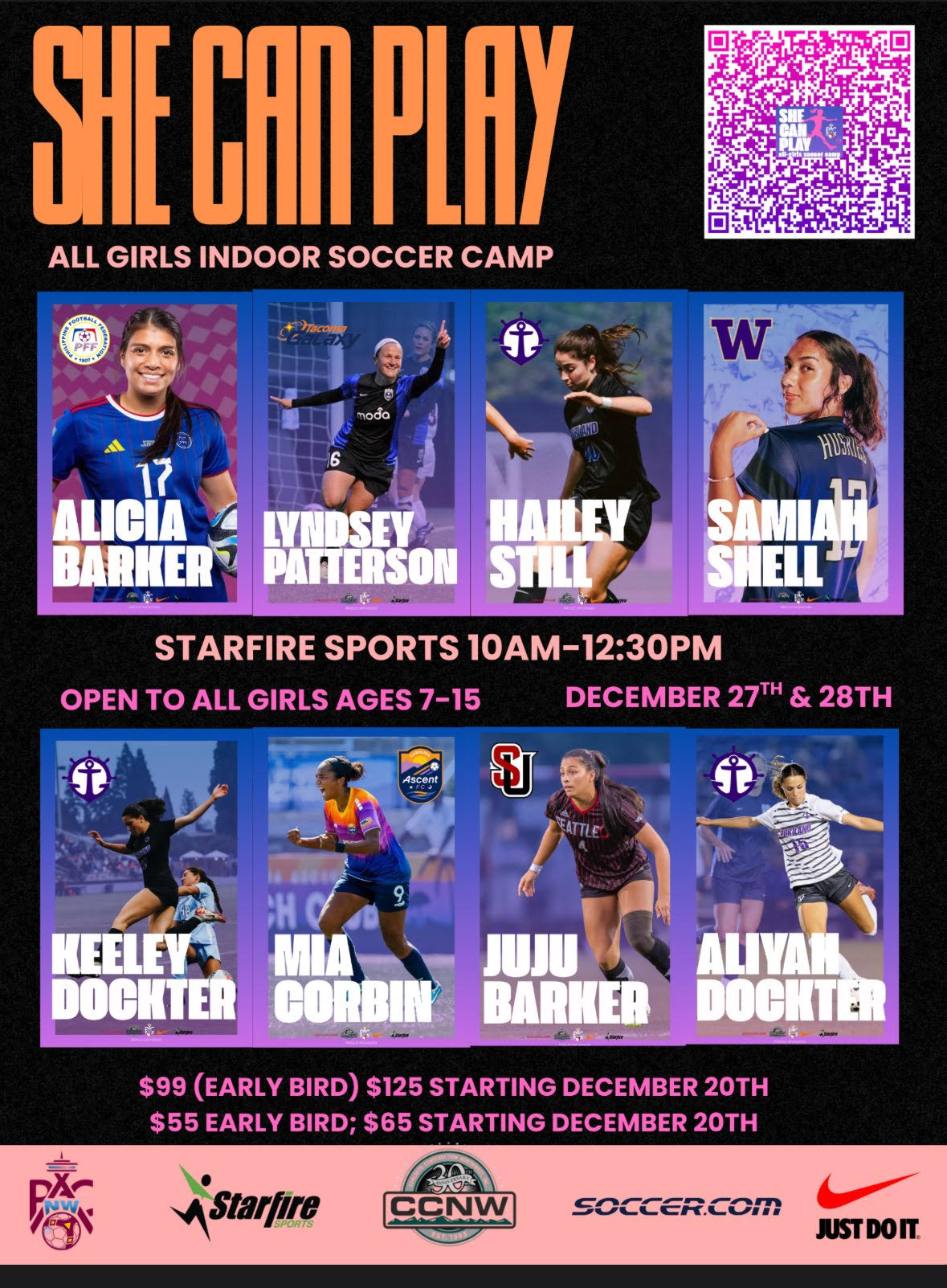 The She Can Play camp is more than just training: it’s a place where young girls find inspiration, connect with positive role models, and build lasting friendships through the game they love. Open to all skill levels, the camp fosters a supportive and empowering environment where players refine their technical skills, master ball control, and grow in confidence through dynamic small-sided games. Our goal is to help every participant develop as an athlete while deepening their passion for soccer in a fun and engaging setting.
